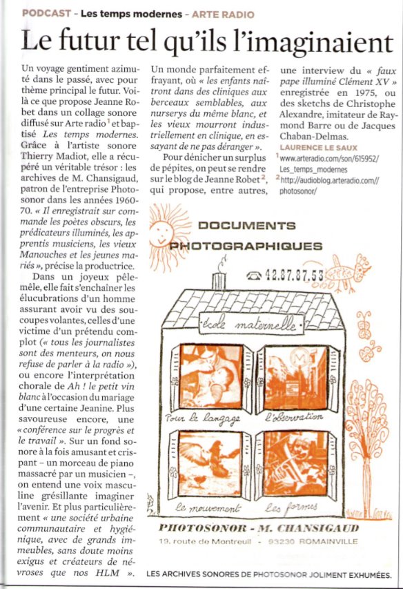 Dans les années 60-70, M. Chansigaud est artisan sonore à Romainville. A l’enseigne de « Photosonor », il enregistre des disques vinyle à la demande : mariages, conférences, fêtes des écoles, rock manouche… L’artiste Thierry Madiot a hérité de ces archives ahurissantes et les a confiées à ARTE Radio pour les numériser et les exploiter. Jeanne Robet en propose un montage rétrofuturiste : l’avenir vu par les doux rêveurs de l’époque, prophètes de l’apocalypse ou rockers progressifs.